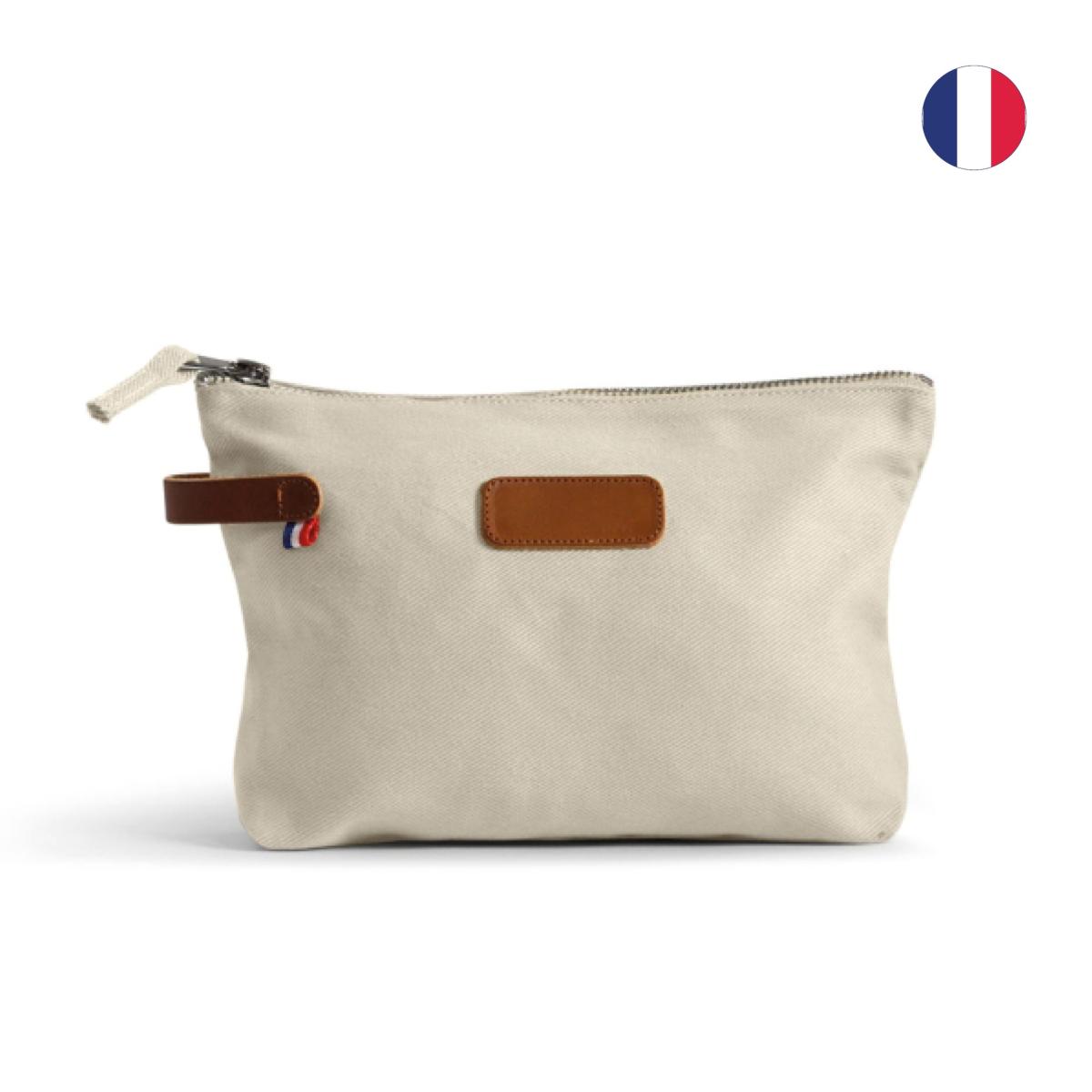 Trousse écologique, spacieuse et durable. Fermeture zippée. Puce drapeau tricolore. Dimensions : 25 x 16 x 3 cm. Fabrication en France.