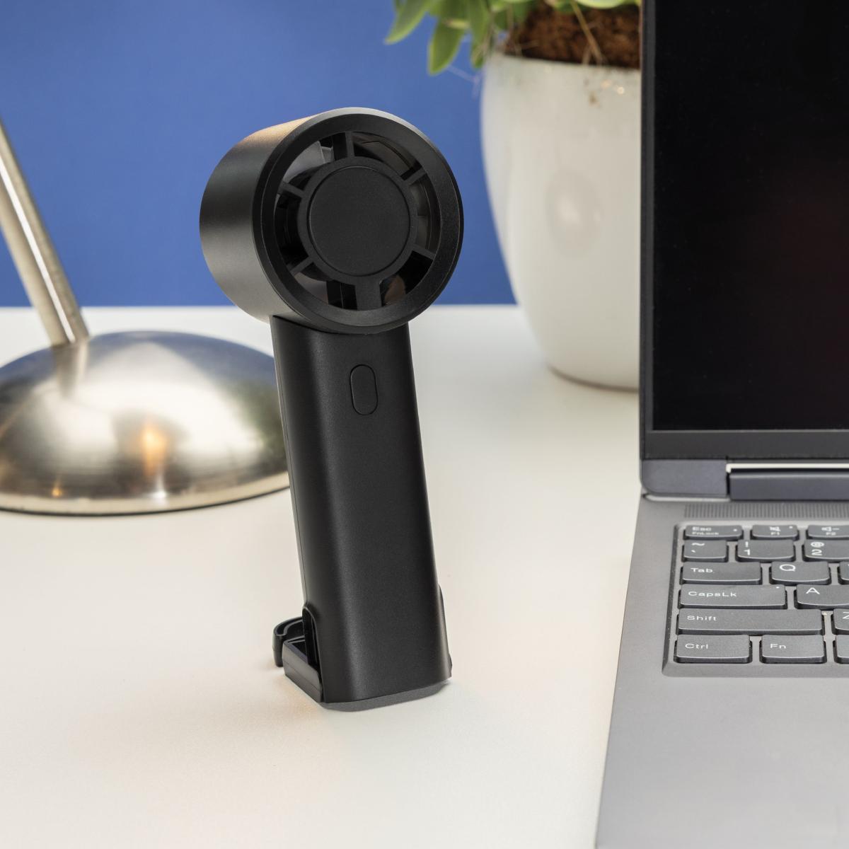 Ventilateur portable. Compact et polyvalent. Boîtier élégant. Batterie Li-ion rechargeable de 1 200 mAh, offrant jusqu'à 6 heures d'autonomie avec seulement 3 heures de charge. Câble USB-A vers USB-C en TPE noir de 30 cm inclus. Trois niveaux de vitesse réglables et crochet extensible servant également de support. Idéal pour une utilisation sur un bureau ou en voyage. Le boîtier est fabriqué à partir de plastique ABS recyclé certifié RCS. Sans PVC. Emballé dans une boîte en kraft certifiée FSC®.