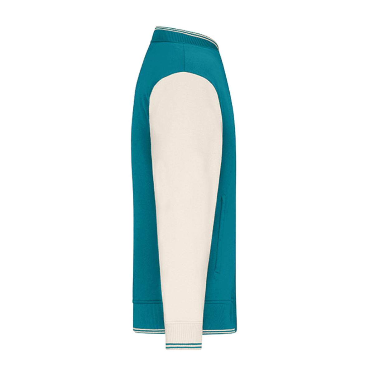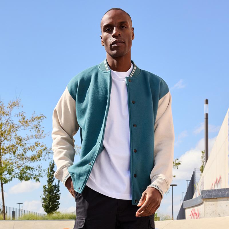 Veste teddy en coton biologique et polyester recyclé. Coupe Unisexe. Coupe classique revisitée avec coupe droite et manches contrastées. Col bomber et bords en côtes à rayures contrastées au col, aux poignets et à la taille. Intérieur molletonné pour assurer chaleur et confort. Fermeture à boutons-pression. Deux poches latérales. Modèle rétro et tendance.