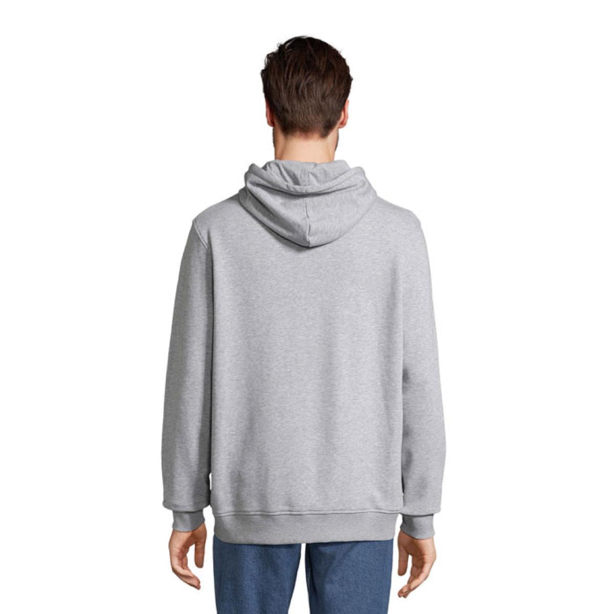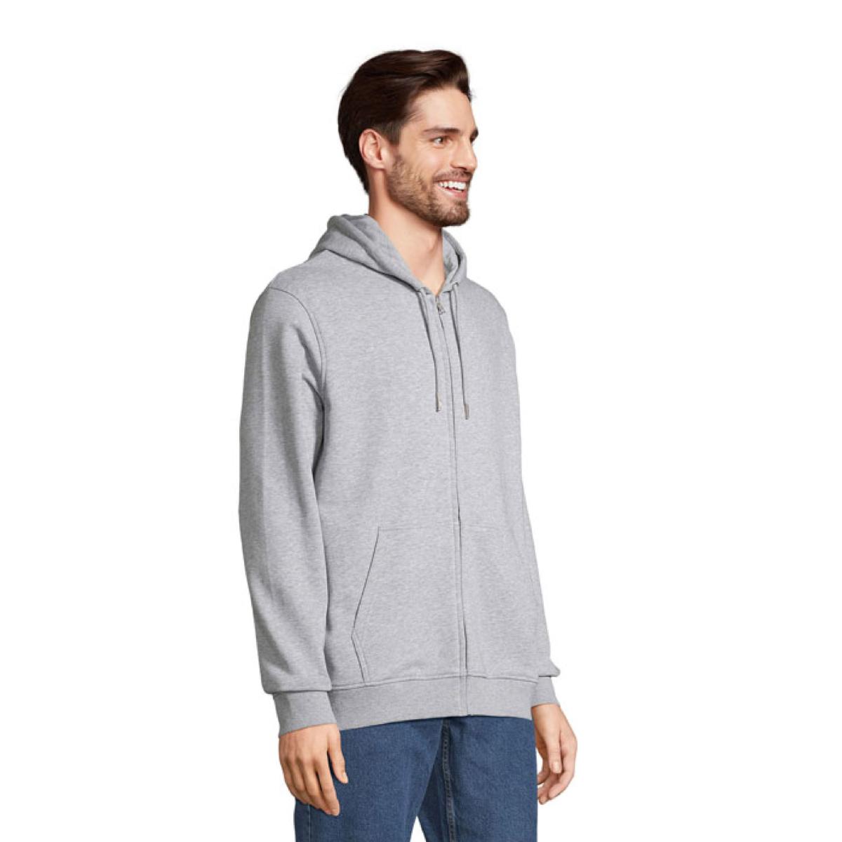 Veste zippée à capuche unisexe. Coupé cousu. Manches montées. Poignets et bas en bord côte 2x2. Poche kangourou.